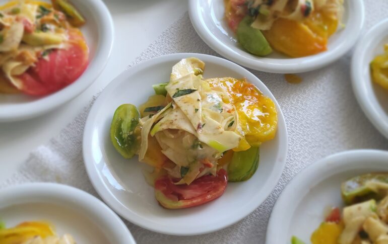 Die Tomaten mit einem Messer einritzen und vorsichtig schälen, in Scheiben schneiden und mit Salz und Olivenöl marinieren.