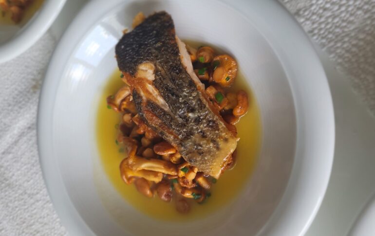 Die Pfifferlinge mit etwas Butter ansautieren, mit Salz würzen und mit etwas Kartoffelfond auffüllen, mit fein geschnittenem Schnittlauch abschmecken. Das Pfifferlingsragout auf einem tiefen Teller verteilen und das Seeforellenfilet daraufsetzen.